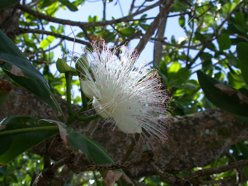 Barringtonia asiatica : les feuilles de ce gros arbre sont très grandes (15 à 45 cm) ; ovales, elles ont un aspect vernissé, brillant, et sont plutôt placées aux extrémités des branches qui montrent aussi des fleurs volumineuses avec beaucoup d’étamines longues et voyantes. La forme des fruits a donné son nom à l’arbre : le nom malgache est Fotabe, Fotatra ou Bonnet d’évêque puisqu’ils présentent 4 faces ou côtes saillantes qui font penser à un bonnet d’évêque. Ils sont fibreux comme les noix de coco ; très légers ils peuvent voyager sur les océans en flottant. Toujours vert, cet arbre revêt un caractère sacré auprès de certaines tribus. La traduction littérale du nom de la ville principale de Sainte-Marie, Ambodifotatra, dont le nom signifie "au pied des fotatras", ce qui laisse deviner que l'Ile était recouverte de ces arbres à la base imposante. La graine oléagineuse contient des principes toxiques utilisés pour la pêche des poissons. Le bois résistant sert à la confection des pirogues.