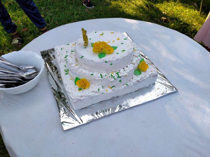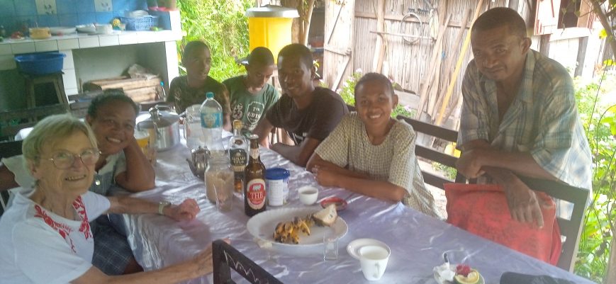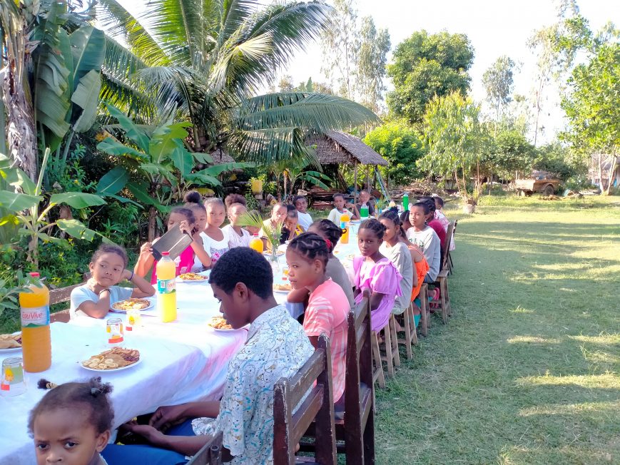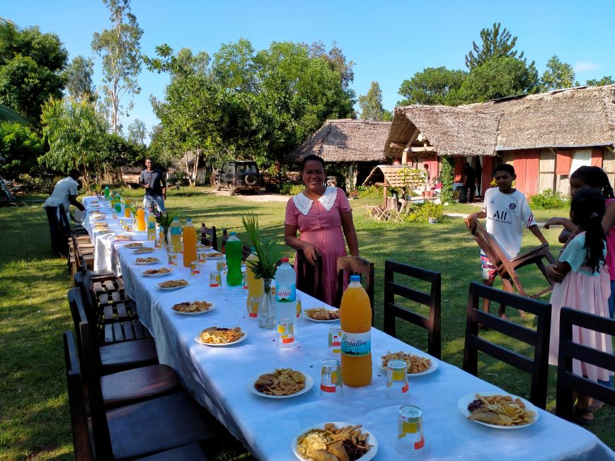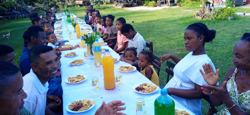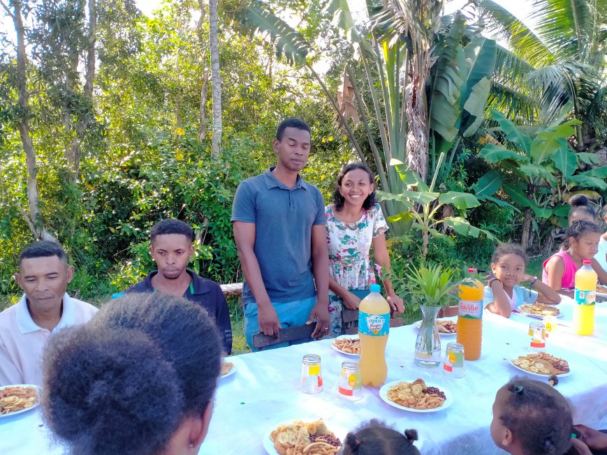 Nous avons de la chance : nous sommes invités à la fête d’anniversaire (5 ans de mariage, voir les photos de la noce dans le "journal de bord" en 2021) de Felana et Elysé, avec sa maman de Fénérive et quelques amis choisis. La table est immense, car tous les élèves sont là aussi.