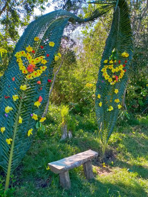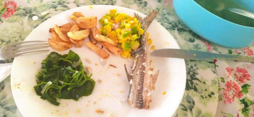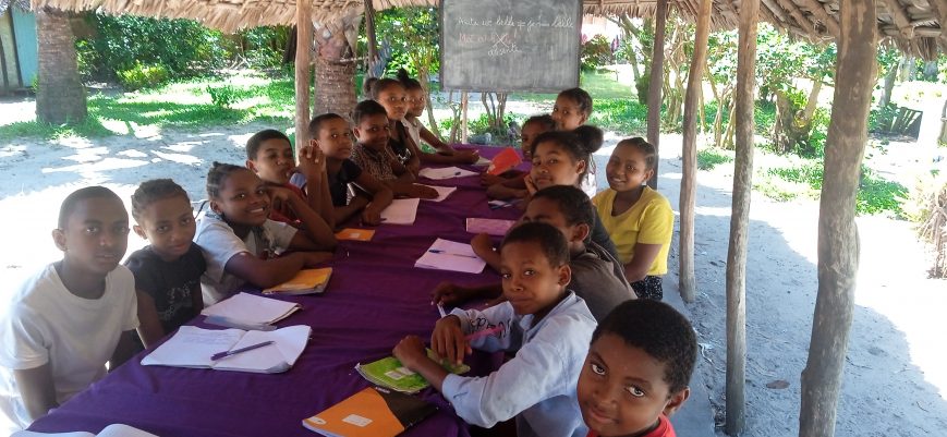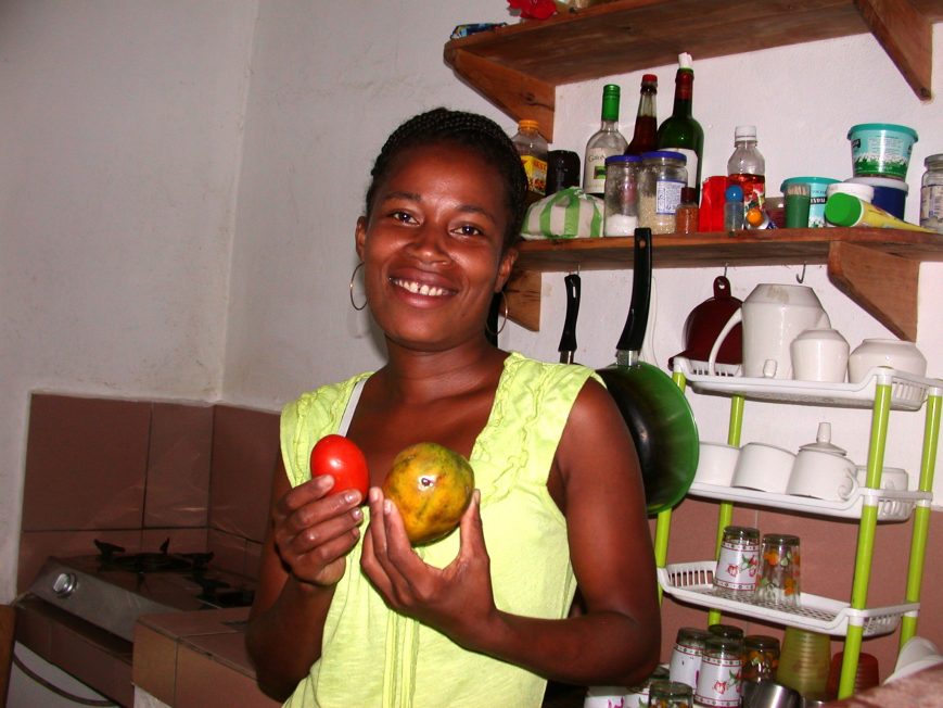 On décore de photos deux murs de la maison. Des parents viennent dire bonjour. Le papa de Mandelah avec un sac d’avocats : c’est la saison, et ils sont « à tomber » ! Nul besoin de vinaigrette ou de mayonnaise. On comprend que c’est un fruit, comme la pomme cannelle, Annona squamosa, fruit de l’Attier, de la même famille que le corossol. Sa chair juteuse et sucrée nous fait penser à la compote de pommes de chez nous. La maman de Saïlah et Sylvannah nous comble de bananes. Quant à Christiane, elle découvre des brèdes, surtout les brèdes Mafane, une sorte de cresson un peu amer, qu’elle cuisine comme des épinards frais.