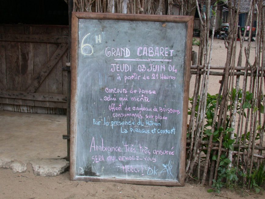 Le soir, sur les conseils du patron de La Pirogue, nous allons au « bal-poussière » du village. L’entrée y est bien moins chère (5000 Fmg) et pourtant l’ambiance ici est bien plus chaude que l’avant-veille à Fénérive. Cela se passe dans une salle communale, avec de nouveau des jeux d’argent à l’extérieur – on n’y comprend pas grand’chose, car cela va trop vite pour nous. Tout le monde danse, sauf les acharnés qui vont « perdre leur culotte » dehors. Le patron, très aimé par la population, assiste au bal avec quatre jeunes boursières américaines baraquées comme des athlètes des J.O., de passage à Mahambo pour étudier dans la région le comportement du Foussa-Foussa, seul animal réputé dangereux de l’île : elles font évidemment un tabac auprès des jeunes Malgaches en vadrouille...